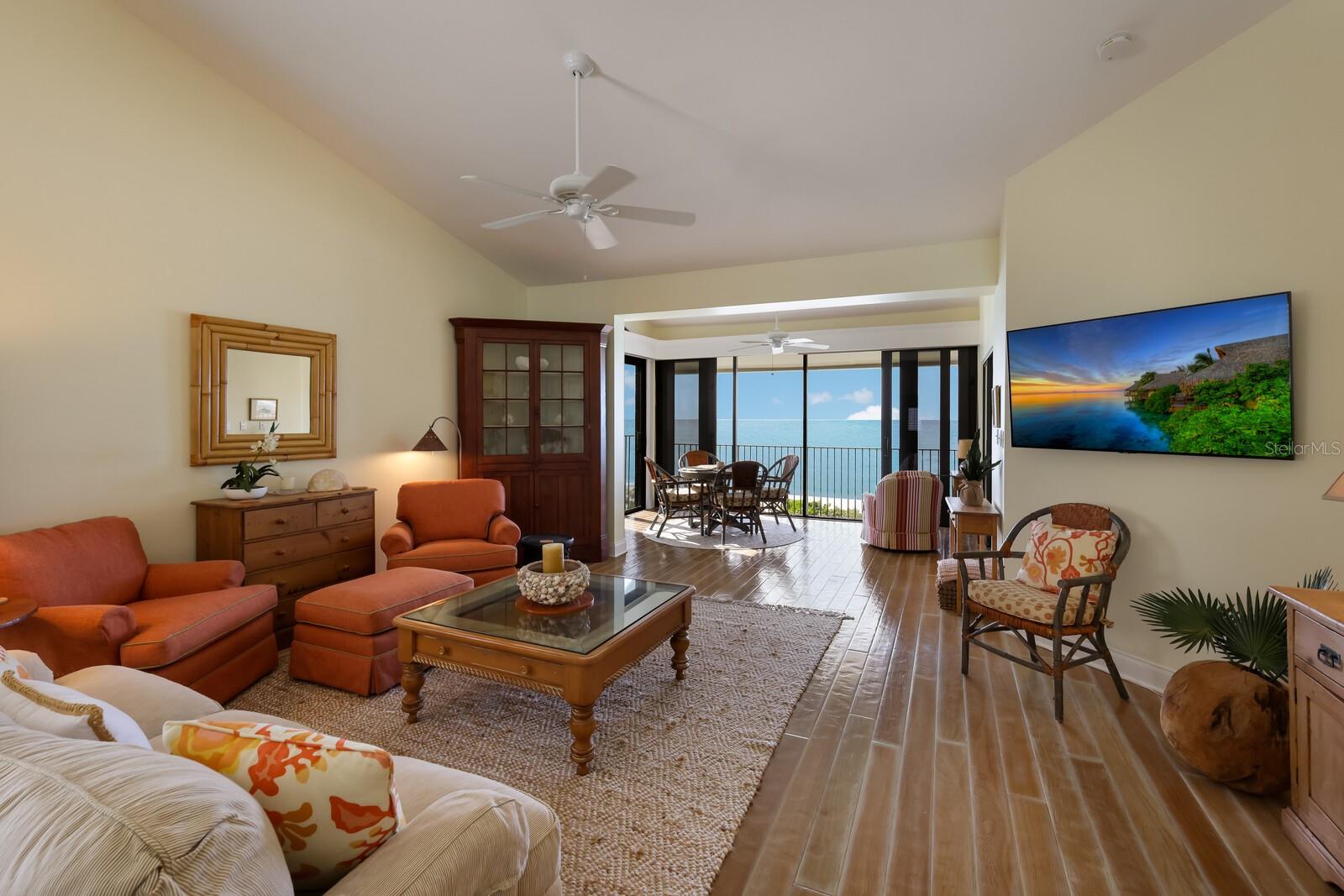 Welcome to this premier beachfront location at the gulf-front Boca Grande Club. This rarely offered top floor, south exposure, corner unit condominium provides unobstructed 180- degree Gulf of Mexico views, and miles of pristine Boca Grande coastline. Truly spectacular is an understatement! This is one of the most private locations in the entire Club Community. Spacious "en suite" master and guest bedroom suites are complimented by an all season lanai both climate controlled and equipped with a queen sleeper sofa to accommodate that occasionally needed third sleeping area. As a top floor residence, you will love the open spacious feeling provided by the vaulted ceilings. Also included are impact glass windows and sliders, plantation shutters, full size side by side washer/dryer, and closet systems in most closet locations. The updated kitchen, bathrooms, and wood flooring throughout the main living area make this island paradise move in ready and includes furnishings! Enjoy this magnificent, gated, community with its private beach, ever popular beachfront clubhouse dining facility, Tiki bar, fitness center, heated swimming pools, tennis complex, and concierge beach service. Photos taken pre hurricane's Helene and Milton.